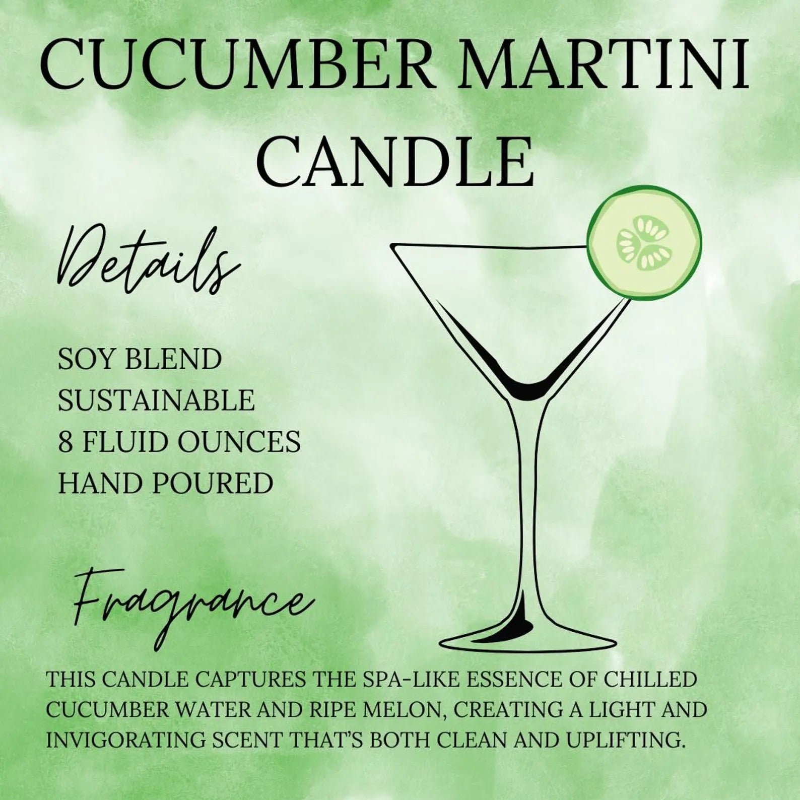 Cool, crisp, and oh-so-refreshing—our Cucumber Martini Candle is a stunningly realistic take on your favorite cocktail. Hand-poured to mimic the look of a freshly mixed martini, this candle captures the spa-like essence of chilled cucumber water and ripe melon, creating a light and invigorating scent that’s both clean and uplifting. Whether you're unwinding after a long day or setting the mood for a stylish gathering, this candle is the perfect touch of elegance and freshness. Cheers to ambiance done right!