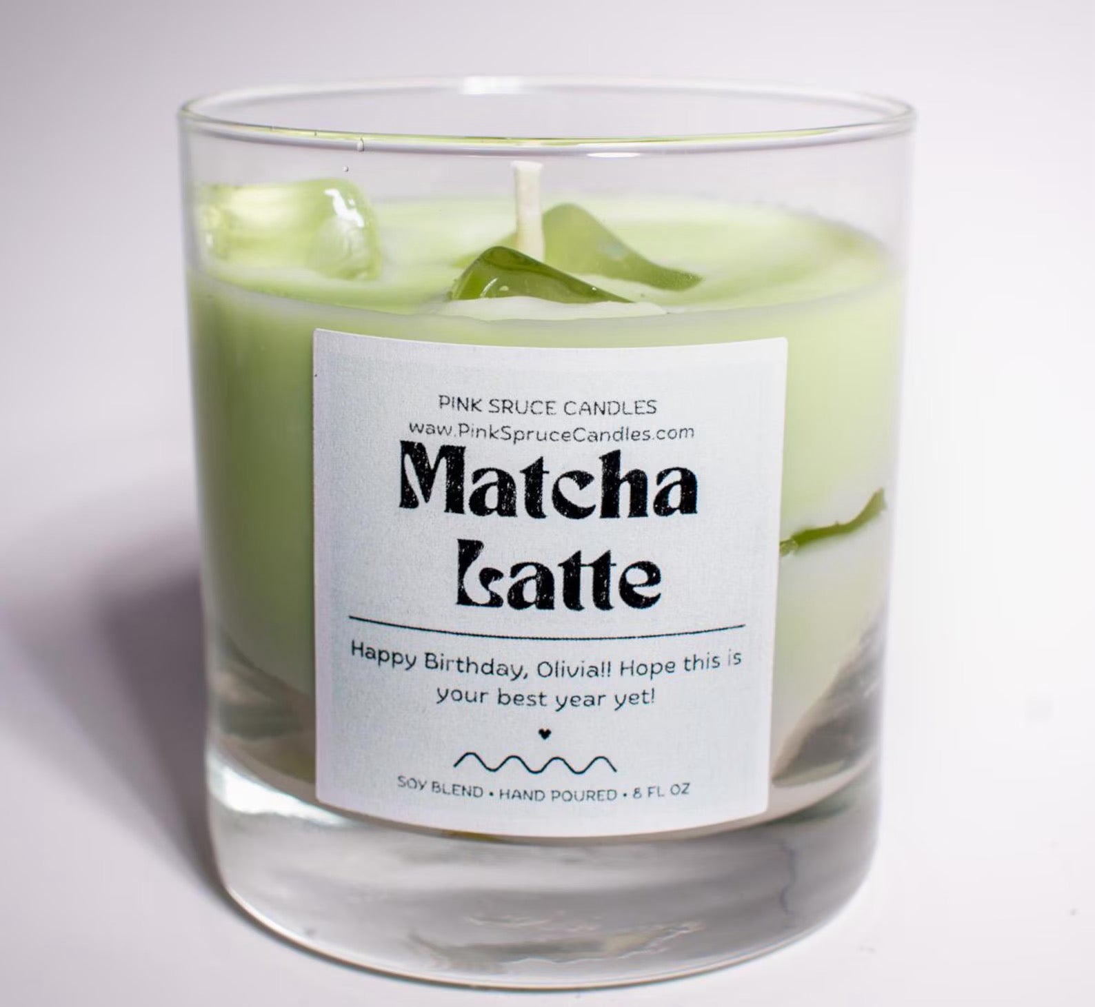 Indulge in the warm, soothing aroma of a freshly whisked matcha latte with this hand-poured soy candle. Housed in a sleek, clear glass jar, this 8 oz candle features a creamy green wax that mimics the vibrant hue of a real matcha drink. The unique iced-latte design, complete with realistic wax "ice cubes," adds a delightful touch of realism. Made with a sustainable soy blend for a clean burn, this candle fills your space with the earthy, slightly sweet scent of matcha, balanced with hints of frothy milk. Perfect for tea lovers and those who enjoy fresh, cozy fragrances.